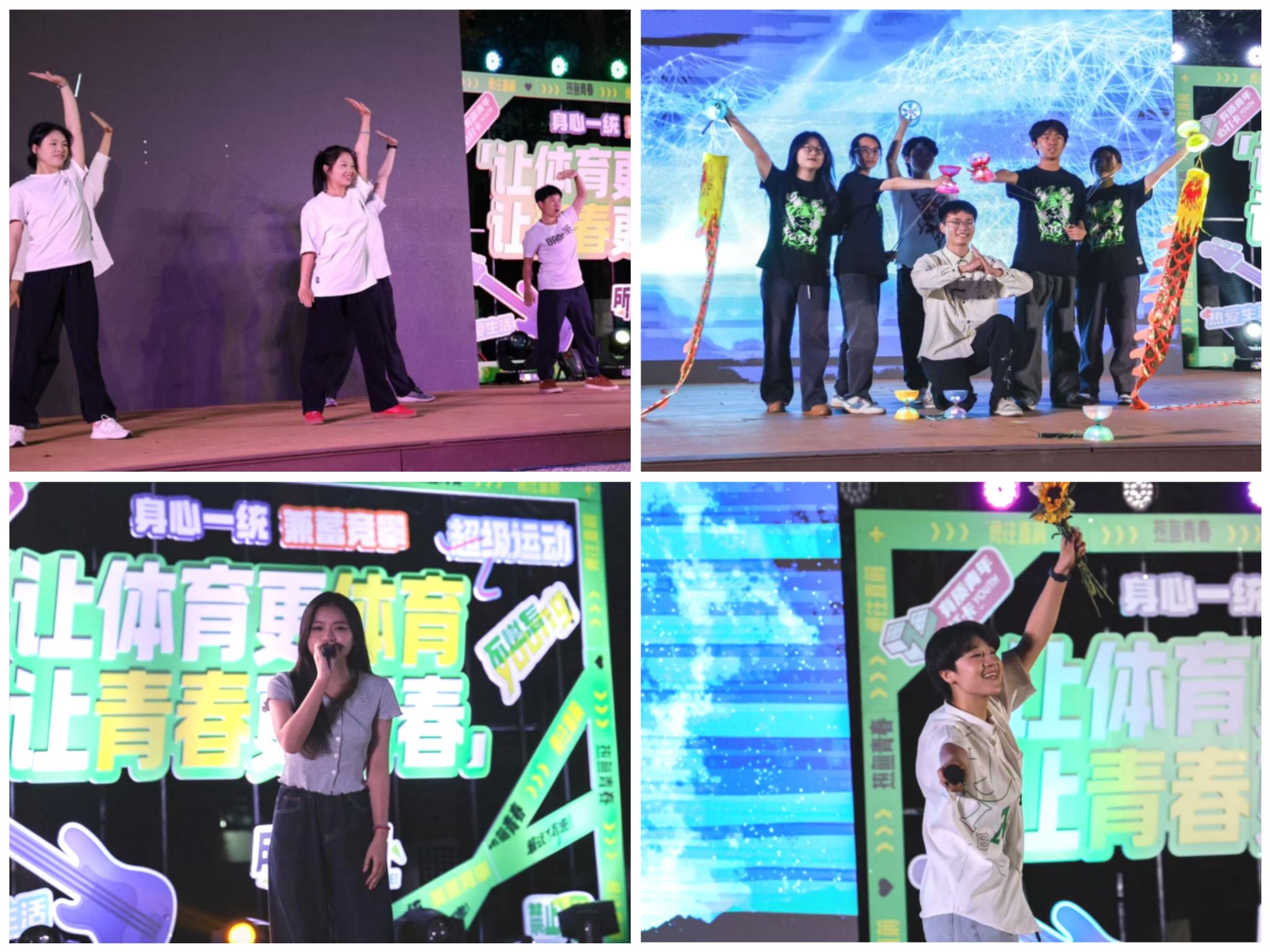 音乐节以“斑斓启幕,华彩初绽”为青春奏响序章。体育教学学院体海星辰气功队以活力四射的《开工醒神操》点燃全场热情,空竹社《铃式交响曲》将传统技艺与现代律动巧妙相融,惊艳众人。吴沛恩深情演唱《一格格》,用清新甜美的歌声传递爱意与憧憬;陆思彧则以《爱爱爱》展现音乐中爱的力量,瞬间掀起青春热浪。