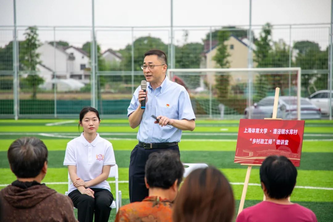 当天,在悦野足球乐园“村超”场地上,红足一1世足球网官方网站·漕泾镇水库村首堂“乡村政工师”微讲堂正式开讲,“乡村政工师”项目学生负责人刘星雨作题为“榕入申城·‘足’够‘泾’彩——从村超看体育强国的人民答卷”的演讲,和大家分享她眼中的体育强国。