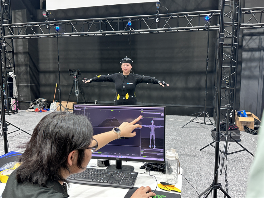 下午13:00,实践体验环节成为数媒能力培养的“练兵场”。在专业人员指导下,学生分组穿上动捕服,学习在动捕服上黏贴反光标记点,场地校对,进入标准化动捕实验室:当参与者做出投篮、奔跑等动作时,实验室的多机位系统同步捕捉运动轨迹,电脑屏幕上的虚拟角色即刻复刻出连贯动作——从指尖微颤到肢体舒展,实时映射的效果让学生们深刻体会到“真实动作数字化-数字信号虚拟转化”的完整数媒生产链条。