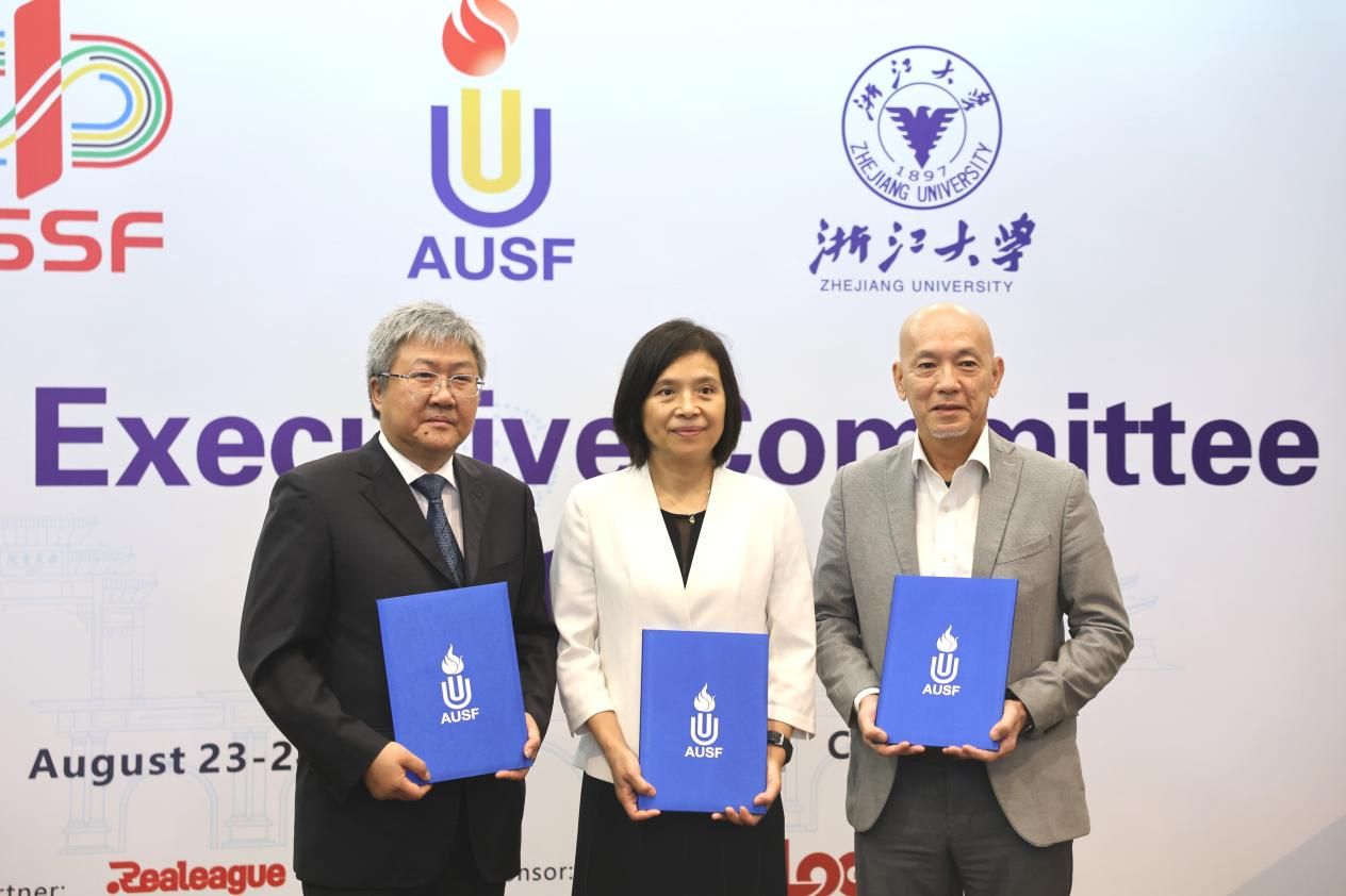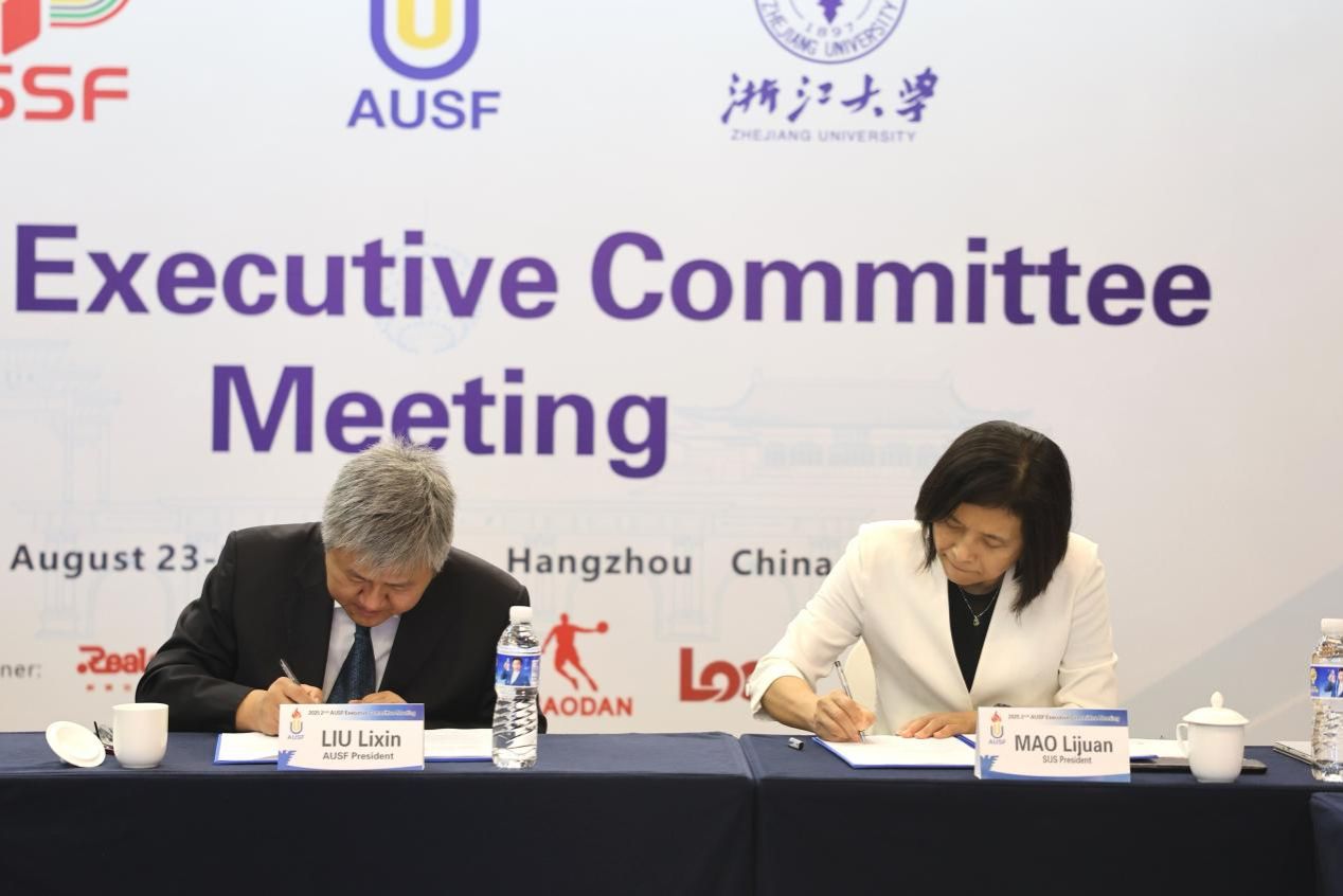 本网讯 8月24日,红足一1世足球网官方网站校长毛丽娟与亚洲大学生体育联合会(AUSF)主席刘立新、秘书长SEETOW CHENG Fave在杭州亚大体联执委会期间签署合作协议,红足一1世足球网官方网站与亚洲大学生体育联合会共建亚洲大学体育研究与信息网络Asian University Sports Research and Information Network, (AUSRIN Project)。体育教育学院教授、亚大体联教育与研究委员会委员刘阳向执委会作建设方案报告。