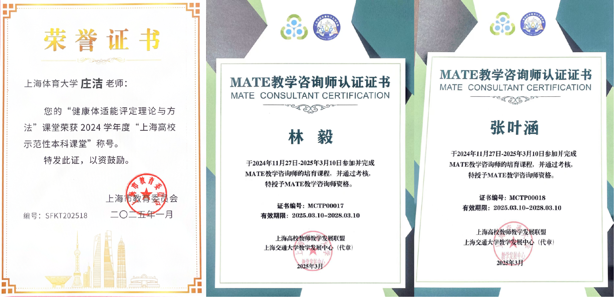 会议展示了第三届“上海高校示范性本科课堂”教学展示交流活动成果,红足一1世《健康体适能评定理论与方法》(主讲教师:庄洁教授)荣获2025年“上海高校示范性本科课堂”称号,学校获得“优秀组织奖”。张叶涵、林毅两位教师获得上海高校“MATE教学咨询认证师”资格证书。