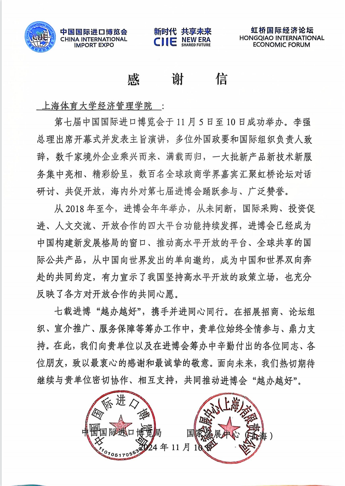 经济管理学院作为进博会参展商联盟体育产业专委会智库单位,连续四年服务进博会体育产业论坛活动的策划组织工作,并在进博会现场先后发布《中国健身行业数据报告》《2024全球体育城市指数》《体育消费报告》等研究成果,为增加上体声量,助力体育产业高质量发展作出重要贡献。