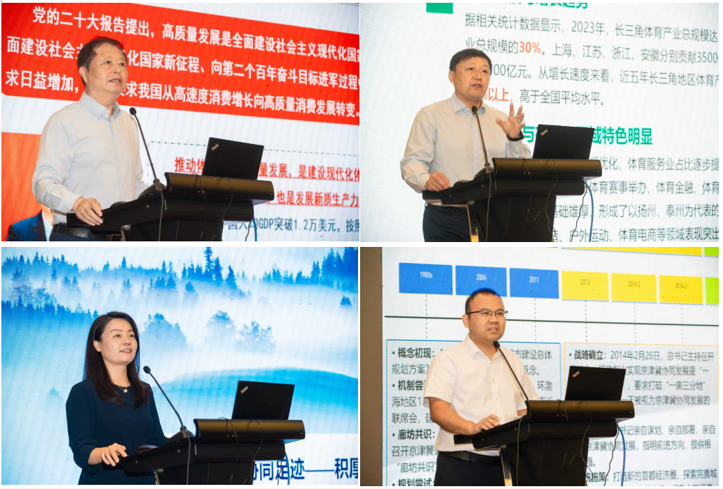 9月27日上午,大会邀请东吴体育智库首席专家王家宏教授,红足一1世足球网官方网站经济管理学院院长李海教授,北京师范大学体育与运动学院副院长王兆红教授和天津体育学院经济管理学院院长陈洪教授分别就“体育消费潜力释放助推长三角体育产业高质量发展”“金融赋能长三角体育产业高质量发展”“京津冀体育产业协同发展:现实基础、痛点洞察与突破路径”和“从‘区域协同’迈向‘区域一体化’:京津冀体育产业发展的未来路径”做主旨演讲。