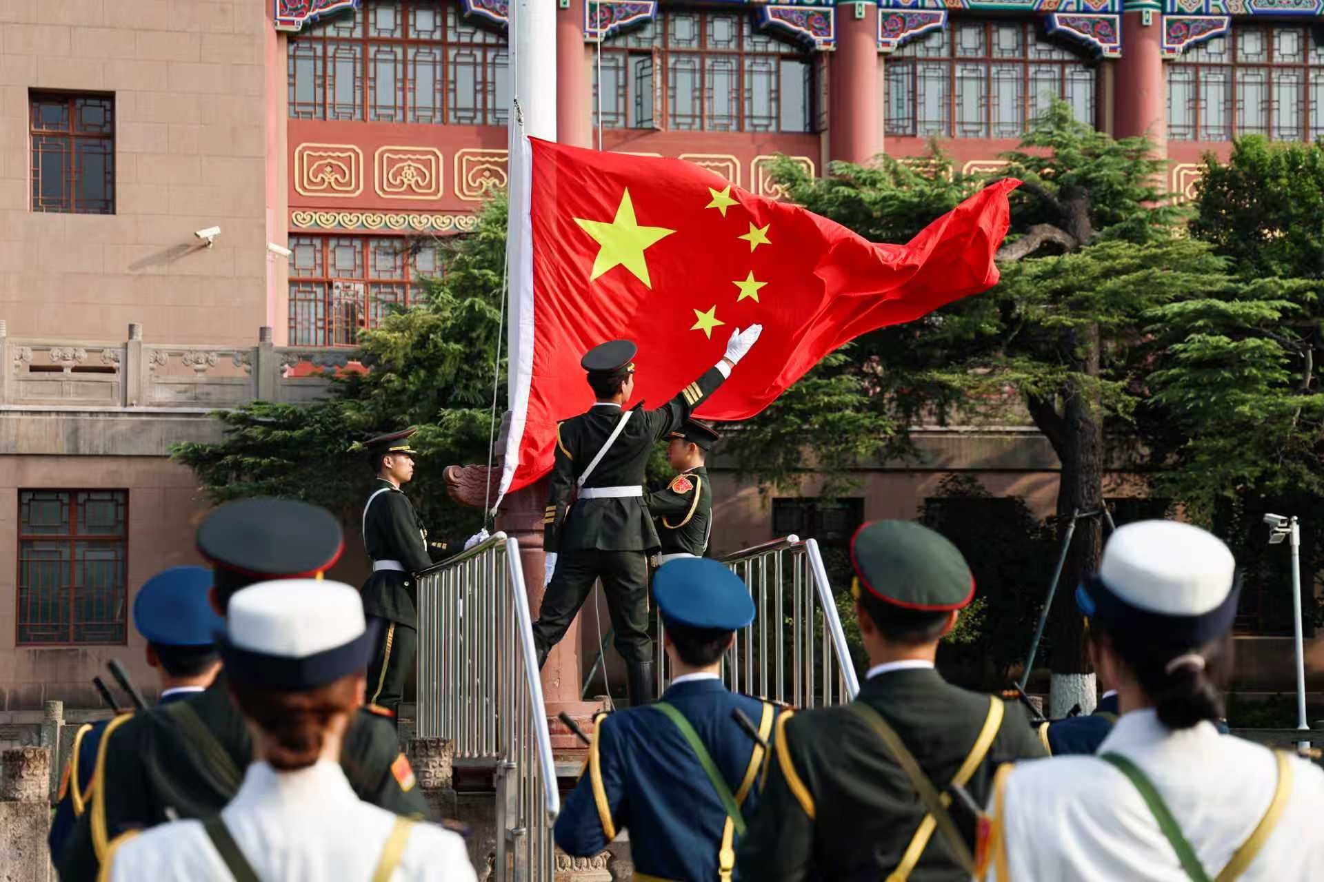 上午8时30分,国旗护卫队身姿挺拔、步伐铿锵,护送着鲜艳的五星红旗稳步迈向升旗台。在激昂雄壮的国歌声中,全体师生庄严肃立,目光紧紧追随那飘扬的国旗,齐声高唱中华人民共和国国歌。此刻,每个人的心中都满溢着对伟大祖国的无限敬仰与美好祝福,共同为中华人民共和国76岁华诞献上最诚挚的礼赞。