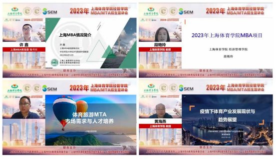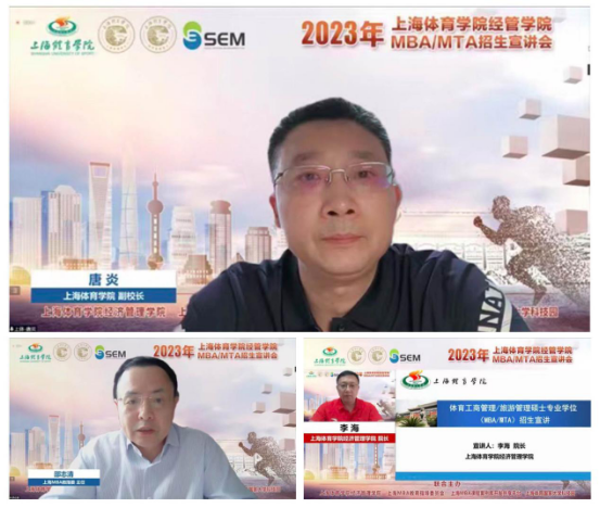 本网讯 2022年6月12日周日,上海体育学院经济管理学院MBA/MTA招生宣讲会在线上顺利举办。本次会议由上海体育学院经济管理学院、上海MBA教育指导委员会、上海MBA课程案例库开发共享平台和上海体育国家大学科技园联合主办,分别在微赞、B站、爱奇艺和视频号等四个直播平台同步直播,观看总量近1万人次。