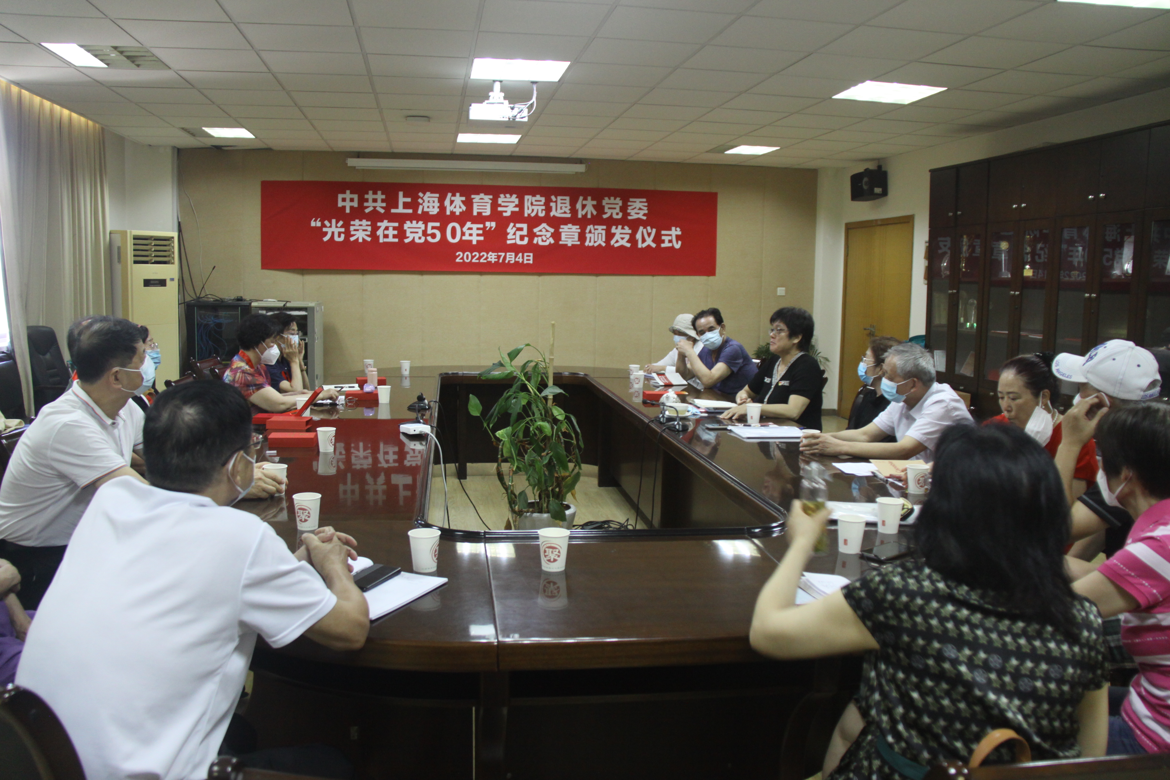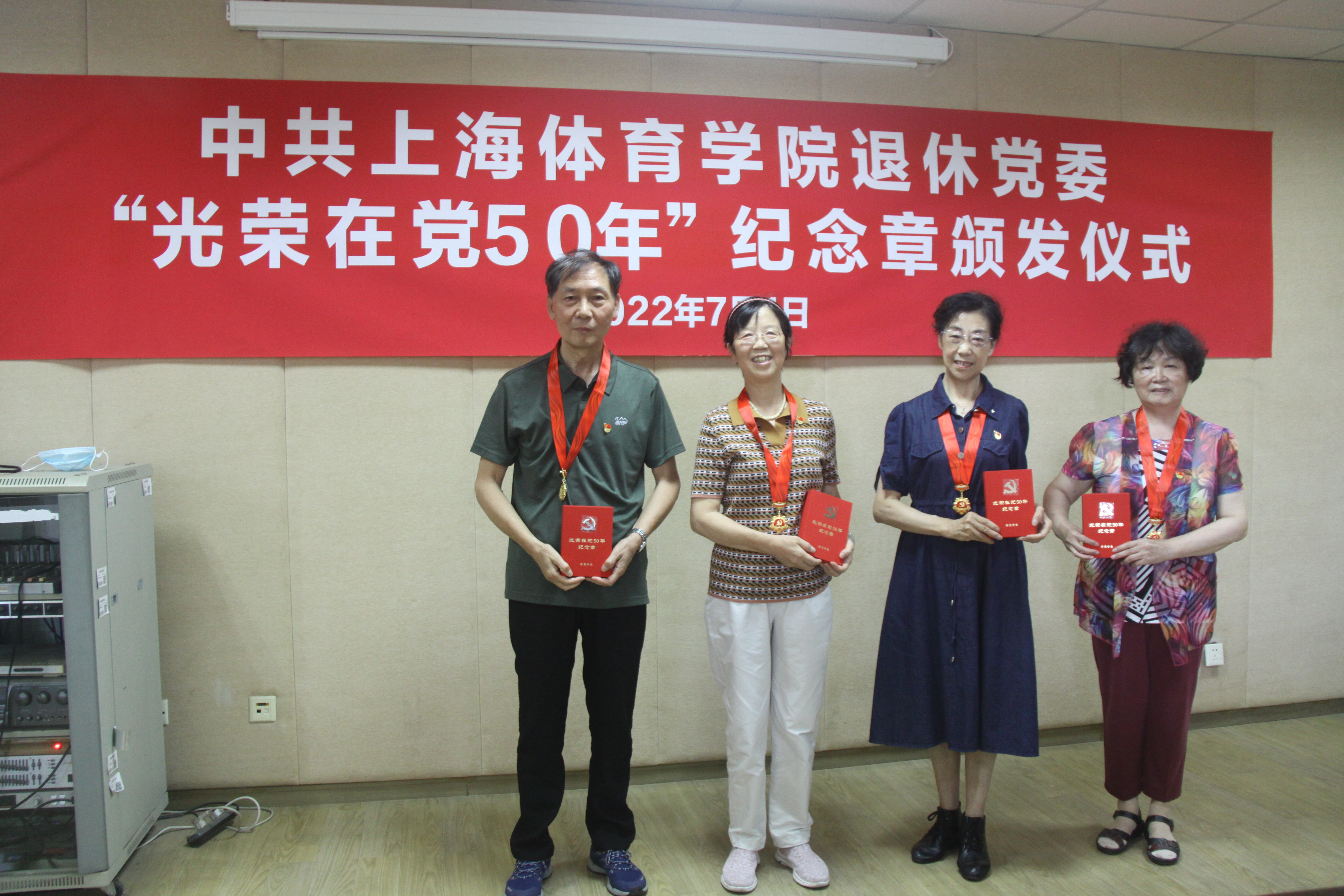 本网讯 7月4日上午,上海体育学院退休党委在庆祝中国共产党成立101周年之际,隆重举办“光荣在党50年”纪念章颁发仪式,向党龄达到50年的范本能、赵惠菊、姚琴仙、李彩琴、郑继明五位退休老党员颁发“光荣在党50年”纪念章。