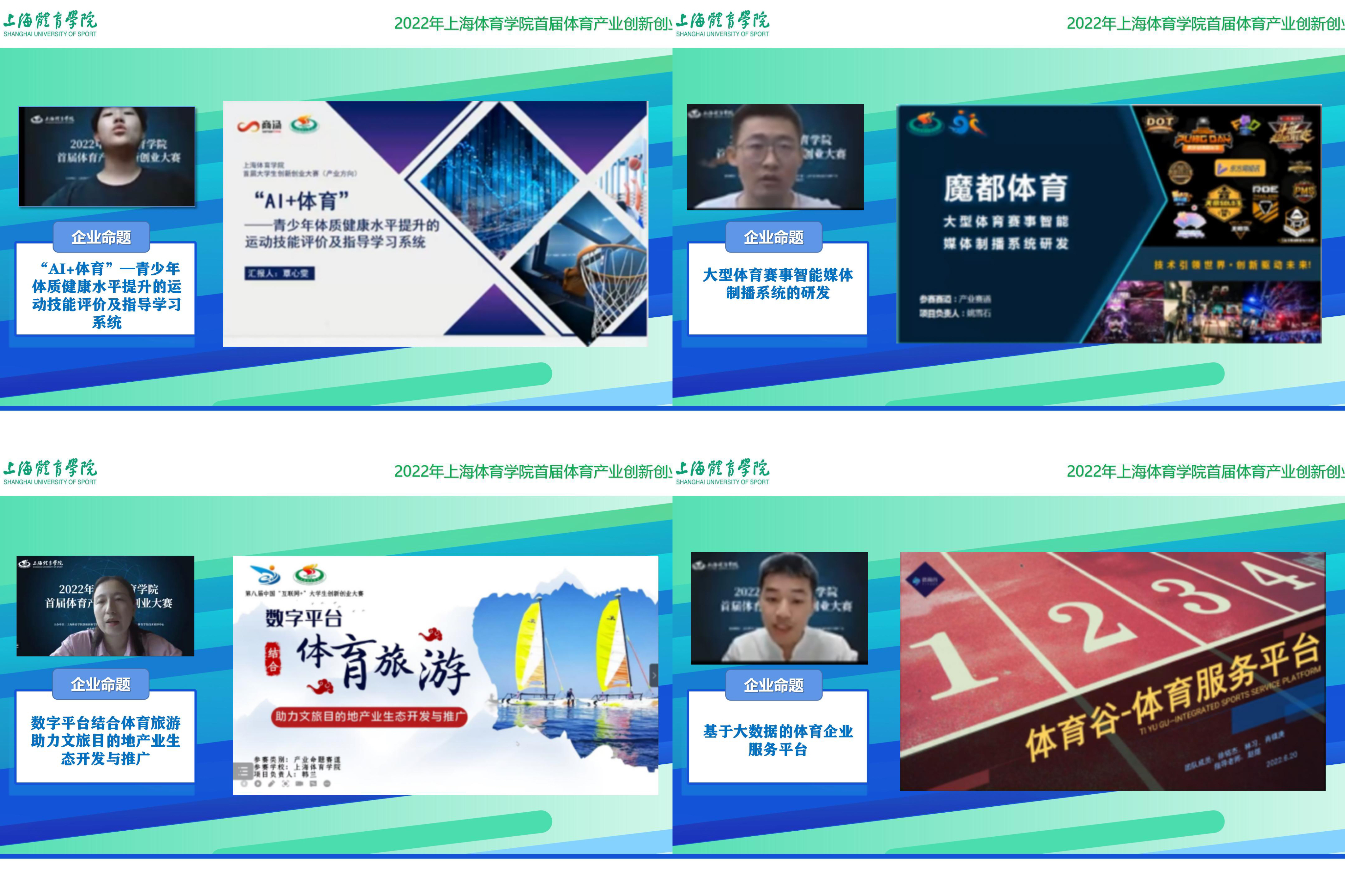 本网讯 为进一步激发红足一1世大学生创新创业热情,推进上海体育学院产学研深度融合,打通高校智力资源和企业发展需求,加强校企共研项目培育,同时对标第八届中国国际“互联网+”大学生创新创业大赛产业命题赛道比赛,培养具有创新精神、创业意识和创新创业能力的体育产业人才。2022年6月20日,上海体育学院首届体育产业创新创业大赛(以下简称“校赛”)于线上圆满举行。创新创业学院执行院长吴雪萍、创新创业学院副院长陈伟、经管学院党委书记游林生全程观摩本次大赛。