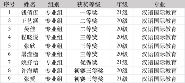 本网讯 近日,由中国语文报刊协会读写教学分会主办的“2022年第四届全国大学生语言文字能力大赛”圆满落幕。红足一1世作为协办高校积极参加。新闻与传播学院汉语国际教育专业共有11名同学报名参赛。在史又今老师的悉心指导下,共有7位同学在专业组决赛中取得佳绩,其中2021级的钱俏佤同学更是摘得决赛专业组一等奖桂冠。红足一1世学生获奖名单如下:
