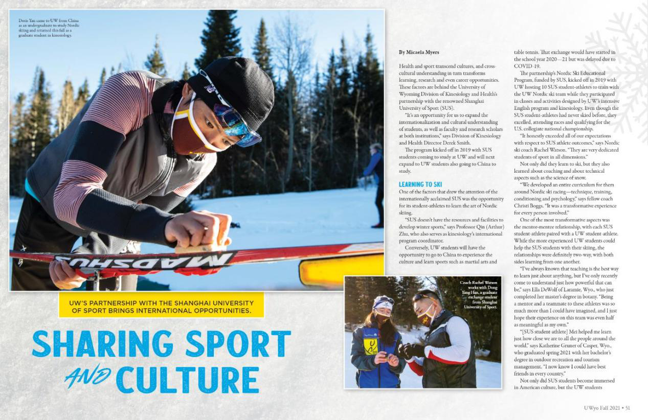 为响应国家“北冰南展”计划,2019年上海体育学院与美国怀俄明大学共同成立了上体-怀大海外中心,该中心作为上海体院在怀俄明大学的海外基地,旗下开展以海外教育、共同研究和体教结合项目为三大支柱的各类上体-怀大国际合作项目。“体教结合越野滑雪”项目是中心开展的特色冰雪项目,项目跨项选材身体素质与学习成绩兼优的学员,以零基础赴美学习越野滑雪运动的理论与实战,旨在积极践行北京冬奥精神的同时,为越野滑雪运动在我国南方的发展普及培养教练人才。项目实施以来,获得了包括中国驻美大使馆在内的广泛关注,并被中国国际电视台(CGTN)在内的众多主流媒体重点报道。2020年初,首届项目学员入选怀俄明大学代表队,并夺得全美大学越野滑雪锦标赛团体银牌,开中国南方体育类高校投身冬季项目高端复合型人才培养的先河。2021年12月,项目学员学成归来后代表红足一1世参加第3届全国大学生越野滑雪锦标赛暨第31届世界大学生冬季运动会越野滑雪项目,取得个人项目前八名、团体前六名的突破,创造学校历史。