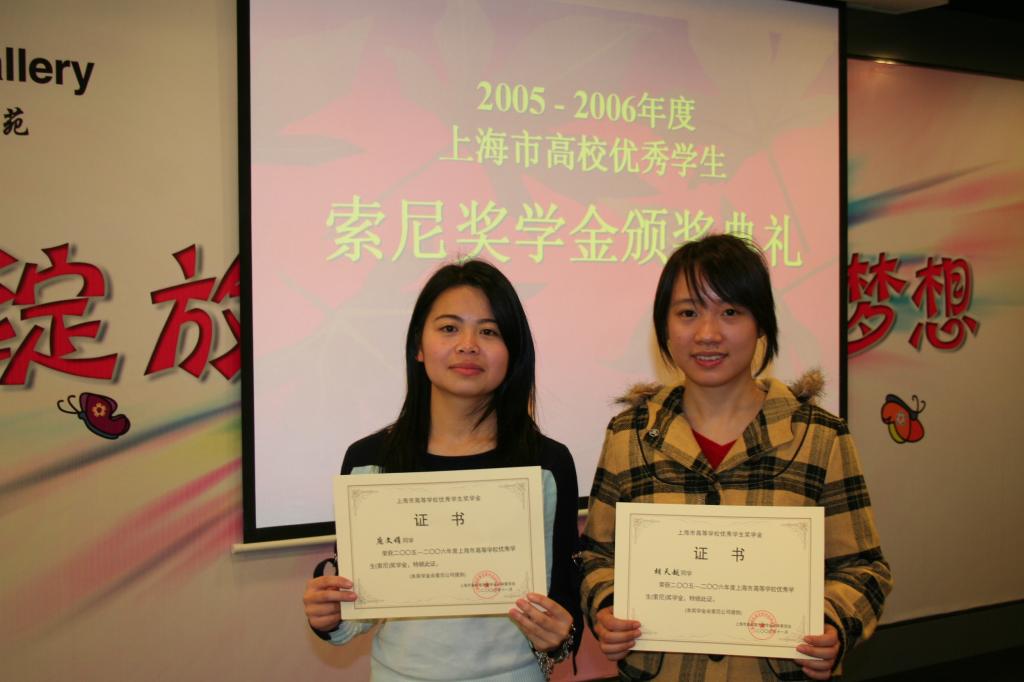 2005~2006年度上海市高等学校优秀学生“索尼奖学金”颁奖仪式于12月12日在淮海中路“索尼梦苑”内隆重举行。我院运动科学学院03级学生胡天越和经济管理学院04级学生庞文娟喜获此奖。