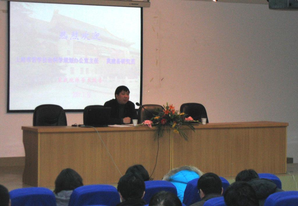 1月10日下午,上海市哲学社会科学规划办公室主任莫建备研究员到我院进行学术讲座。他首先简要介绍了上海市近年申报国家哲学社会科学基金的总体情况,并 肯定了我院在此方面取得的成绩。讲座中,莫主任还重点简述了申报国家社科基金的方法与策略、申请标书的撰写注意事项,并介绍了今年国家及上海社科基金申请 方面的一些重要信息。