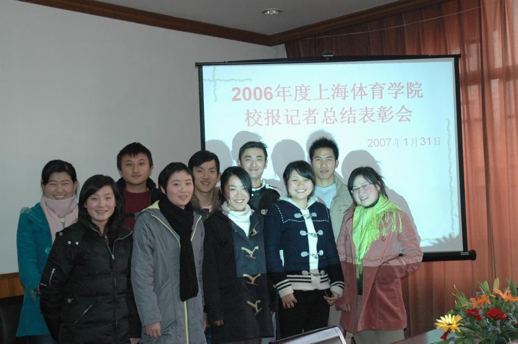 会上对表现突出的校报记者进行了表彰。其中,体育新闻系范昭玉、竞技体育系胡冬获得“2006年度上海体育学院校报优秀记者”称号;体育教育学院陈小康的 《党旗下的五环:一个支部党建网站的精彩故事》、体育新闻系刘佳瑜的《让我们共同呵护这个讲坛》、体育新闻系朱宝砂的《热爱让他们成为黑马——记我院定向 越野队》获2006年度上海体育学院校报优秀作品奖。最后,表彰会在大家的合影留念中结束。