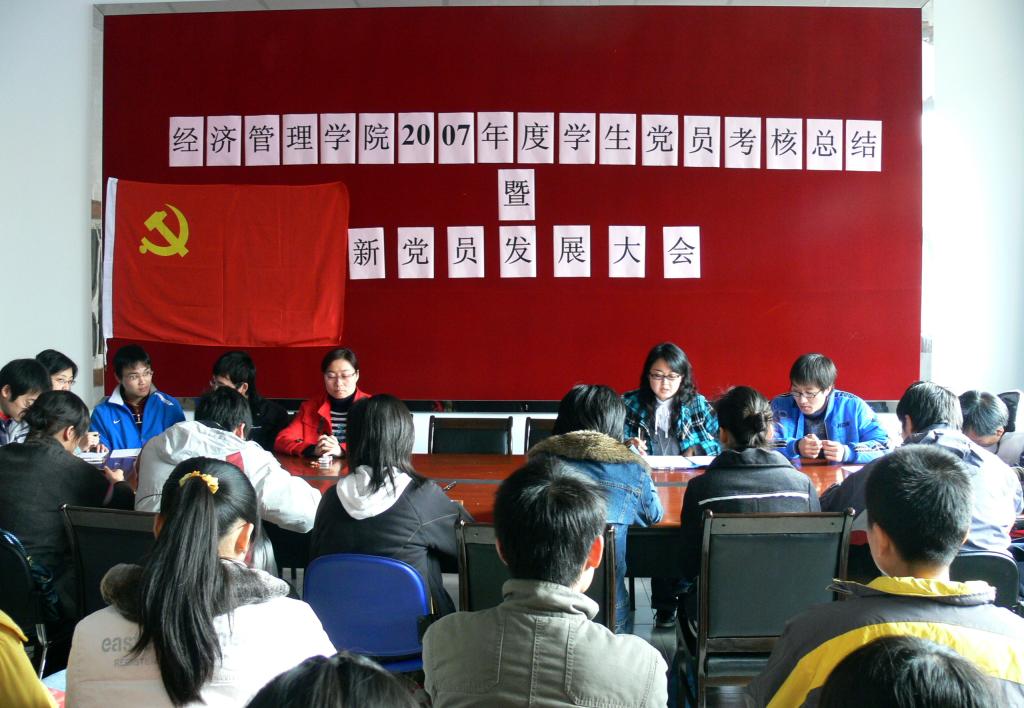 | 12月26日,经济管理学院党总支在活动中心二楼会议室召开了2007年度本科学生的党员考核总结暨新党员发展大会。党总支副书记王青、辅导员肖冬晶、王丽娜出席了会议。 会上,总支副书记王青老师指出,学生党员应该通过此次考评进行自我反省,再接再厉,进一步发挥党员的模范作用;同时处理好各方面的关系,尤其是毕业班的学生党员更应该做好同学间的稳定工作,同学间的互帮互助等。两个辅导员老师分别提出了已经成为党员的同学应该及时与组织汇报情况,不应该有任何思想上的放松,并指出这次考核可以看出学生党员们在同学中的份量是怎样,同时提出了应当通过此次考评进一步了解自己的不足,更好地树立党员的模范形象,对于有困难的同学应该及时帮助安慰。