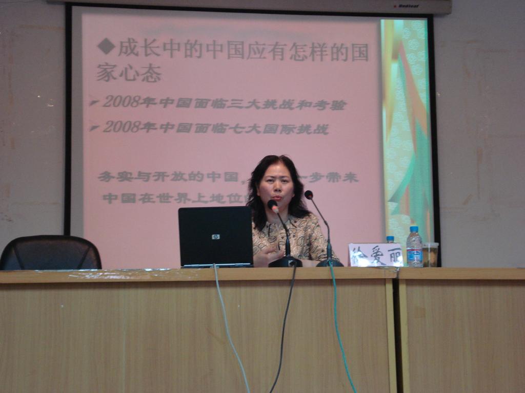 如何继续深入学习贯彻落实党的十七大文件精神?徐老师结合当前国内国际政治经济局势,国家间互动关系,08北京奥运的机遇和挑战,西藏史实和维稳工作,列举了国内外社会、经济、生态的协调平衡发展的理论和实例,为研究生们详尽的地讲解了党的十七大报告中的科学发展观的深刻内涵和现实意义。
