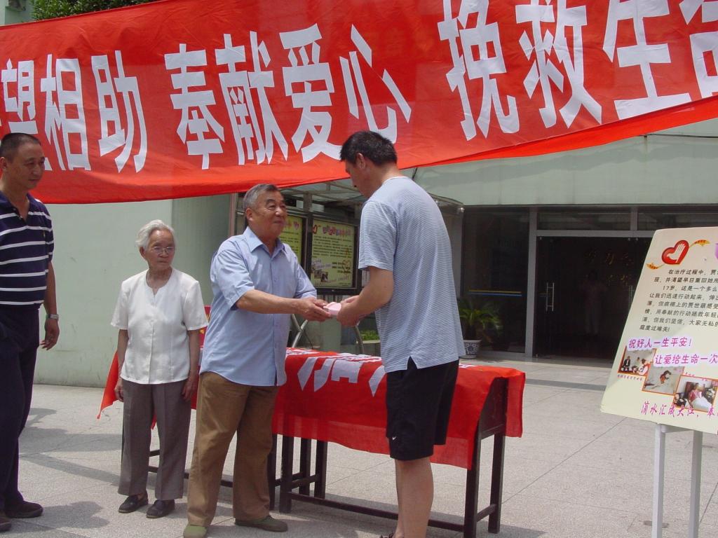 6月17日,体院上下涌动着一股爱的暖流,全院师生员工都在为筹集贾世萌同学骨髓移植费用进行募捐。在募捐现场,最感人的一幕是两位八十多岁高龄的老党员——何以襄和王寿珍夫妇,俩老从组织部部长俞校群老师处获知白血病患者贾世萌同学的病情后,表示要来校参加募捐,把平时省吃俭用好不容易积攒下来的两万元捐赠给贾世萌同学作治疗费用,俩老表示这也是在庆祝自己入党五十周年交的“特殊党费”。