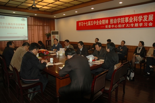 2010年11月5日,我院召开党委中心组(扩大)专题学习会,及时学习传达十七届五中全会精神,旨在以十七届五中全会精神为指引,提高认识,统一思想,把握大局,谋划未来,进一步推动学院事业科学发展。