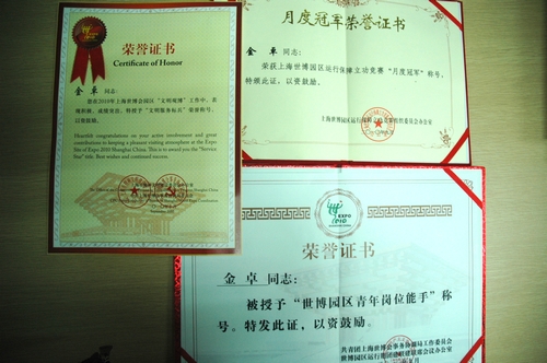 由我院推荐参加世博服务工作的金卓同志,服务世博期间,分别荣获上海世博园区运行保障立功竞赛“月度冠军”称号,被授予“世博园区青年岗位能手”称号,在上海世博园区“文明观博”工作中,表现积极,成绩突出,被授予“文明服务标兵”荣誉称号;由上海市精神文明建设委员会办公室、中共上海世博会事务协调局委员会等多部门颁发了荣誉证书。