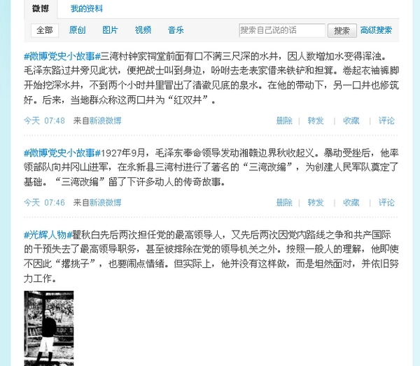 活动从4月下旬持续到6月上旬,主要分为“我的故事和背后的中国梦”主题征文、寻访身边的老党员、“你所不知道的党史小故事”微博征集三个子活动。“我的故事和背后的中国梦”主题征文活动,依托易班等网络平台,以中国共产党成长的九个“十年”为大背景,鼓励全校师生结合党、国家和学校的发展记录自己的成长故事。寻访身边的老党员活动,将学生分为7个小组,通过走访老党员,认真聆听他们讲述身边的故事,重温学校五十多年发展的奋斗岁月。与此同时,通过寻访,也让学生党员感受到了老党员的风采。“你所不知道的党史小故事”微博征集活动则着眼于“鲜为人知”,以新颖的形式挖掘那些可能被大家所遗忘和忽视却为革命事业付出了巨大贡献的无名英雄。