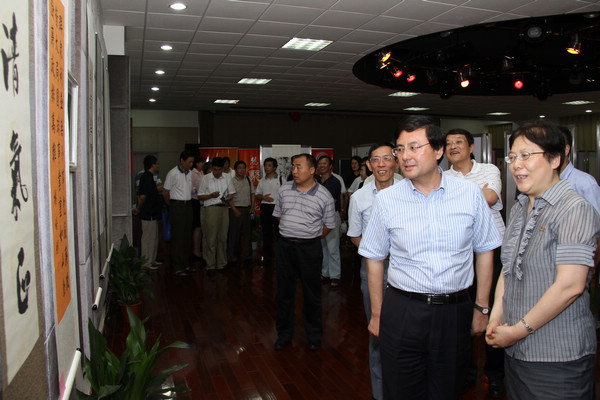 随后上海市教卫纪工委书记黄也放同志为我院获得上海市教卫党委系统 “墨浓情深---上海教育系统庆祝建党90周年书法展”优胜奖的陈晓峰、张建平同志颁发证书及奖品。院党委书记戴健同志宣布“庆祝建党90周年---2011年上海体育学院廉政书画展”开幕。