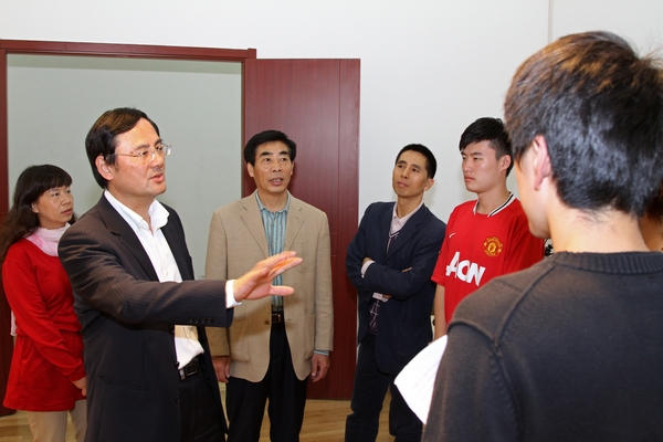 本网讯10月20日下午,院党委书记戴健到体育人文学院考察实验室建设并指导工作。在体育人文学院党政领导班子的陪同下,戴书记对体育人文学院的实验室建设进行考察。参观了演播室、媒介创意实验室、非线性编辑实验室、摄影教学实验室、播音主持实验室、外语情景语音实验室、英语一体化语音实验室、英语自主学习实验室等。体育人文学院院长肖焕禹对实验室的功能、学生实践能力的培养、学生使用情况等进行了详细的介绍。