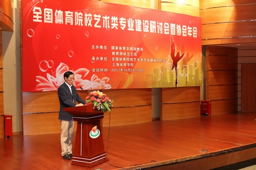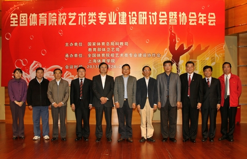 本网讯 10月26日至28日,2011年全国体育院校艺术类专业建设研讨会暨协会年会在我院图文信息楼报告厅隆重召开。本次会议由国家体育总局科教司、教育部体卫艺司主办,全国体育院校艺术类专业协作会、上海体育学院承办。国家体育总局科教司司长蒋志学、科教司文教处处长谢燕歌、全国体育院校艺术类专业建设协作会会长吕万刚、秘书长洪伟、高等教育出版社职业资格认证教育分社社长曹京华出席,来自北京体育大学、天津体育学院、武汉体育学院、上海体育学院等14所体育院校及贵州民族学院等6所综合院校体育院系的七十余名领导、专家、学者参加了会议。我院党委书记戴健、院长章建成出席了开幕式。
