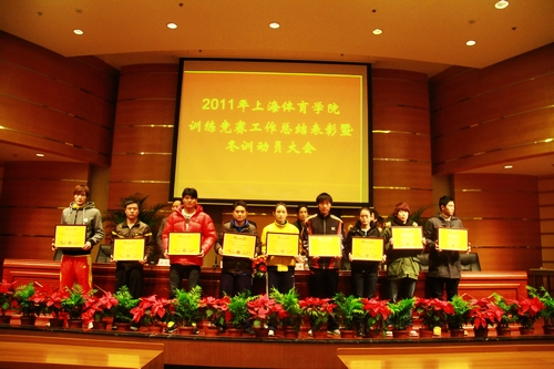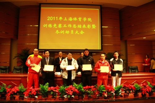 党委副书记、副院长陈晓峰宣布获得2011年度上海体育学院优秀运动队和教练员的表彰决定,获得本年度优秀运动队荣誉称号的项目代表队是:男子田径中长跑队、男子古典式摔跤队、男子拳击队、男子武术散打队、女子武术散打队、武术套路队、健美队、空手道队、攀岩队;获得本年度教练员贡献奖荣誉称号的教练:李国强、陈养胜、沈学军、杨中平、盛泽田、潘峰、张盛海、蒋健、陈新富、席饼嗣、王健清。