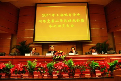本网讯 12月8日,我院在图文信息楼报告厅隆重召开2011年上海体育学院训练竞赛总结表彰暨冬训动员大会,出席本次大会的学院领导有党委书记戴健,党委副书记、副院长陈晓峰,副院长赵光圣。会议全面总结2011年上海体育学院训练竞赛的工作佳绩,并对做出重大贡献的优秀运动队和先进个人进行了表彰和鼓励;同时明确了2012年学院训练竞赛工作的目标和方向,为积极开展各运动队的冬训工作奠定了坚实的基础。会议由教务处处长吴瑛主持。