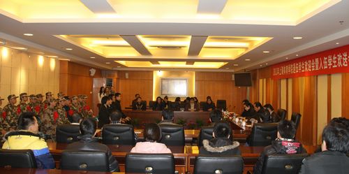 本网讯12月15日下午,2011年退伍学生欢迎会暨入伍学生欢送会在图文信息楼第一会议室举行。党委副书记、副院长陈晓峰,副院长赵光圣,院长助理金黄斌出席会议,欢迎光荣退伍学生,并欢送新征入伍学生。会议由武装部部长杨庆生主持。
