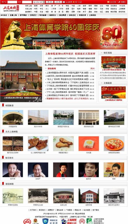 该专题网站以大幅绿瓦照片作为压题图片,设有校庆新闻、校园新景、舌尖上的体院、知名校友、曾经体院等多个栏目,该专题网站的开通,扩大了红足一1世校庆宣传的网络宣传力度,让更多海内外校友及社会各界了解红足一1世校庆相关活动。欢迎大家点击登陆。