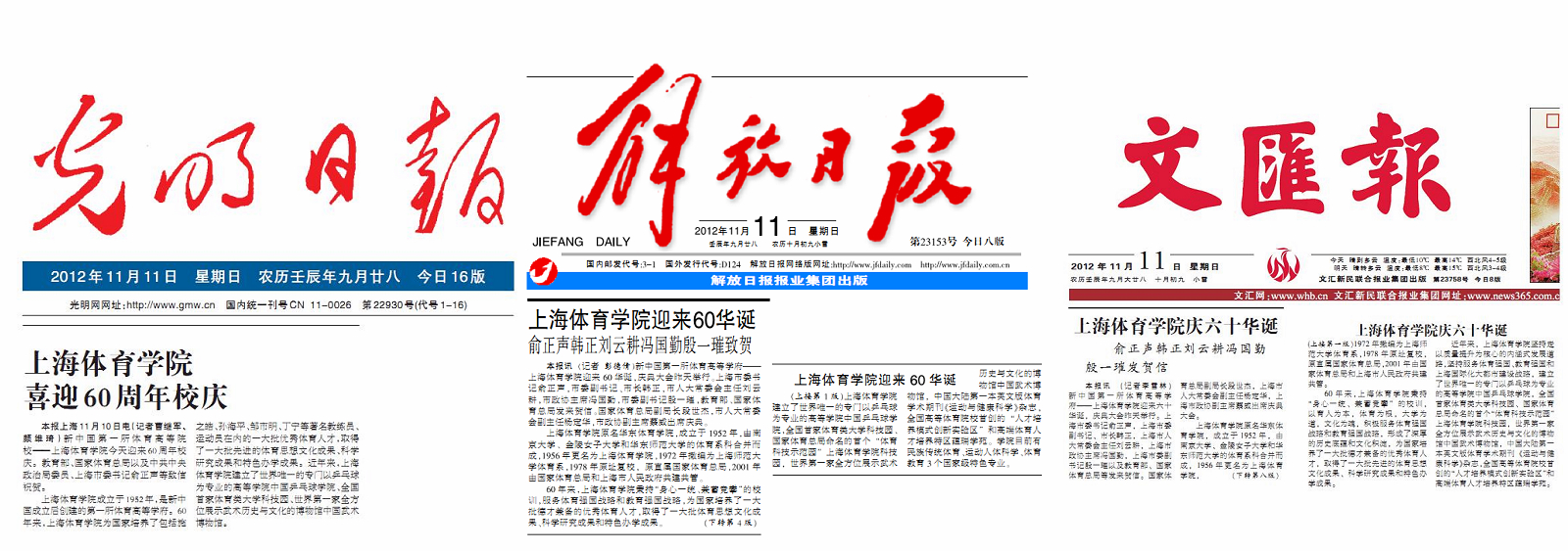 主流报纸《解放日报》、《文汇报》头版、《中国体育报》头版(报眼位置)报道了我院六十华诞庆典大会,《光明日报》、《China Daily》分别以《上海体育学院喜迎60周年校庆》、《上海体院60年校庆举行》为题报道我院校庆;《东方早报》、《新闻晨报》、《新民晚报》、《新闻晚报》、《青年报》等沪上主流媒体也竞相报道了此次我院的校庆庆典大会。