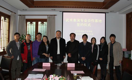 会上,武术学院党总支书记赵晓晗代表武术学院对北京市国际艺术学校一行的到来表示了热烈的欢迎。武术学院院长戴国斌教授与北京国艺李晖副校长代表双方签订合作协议。