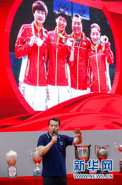 中国乒乓球队的冠军教练、中国乒乓球学院的教师陈彬(原丁宁主管教练)讲述“国乒精神”。上海体育学院供图