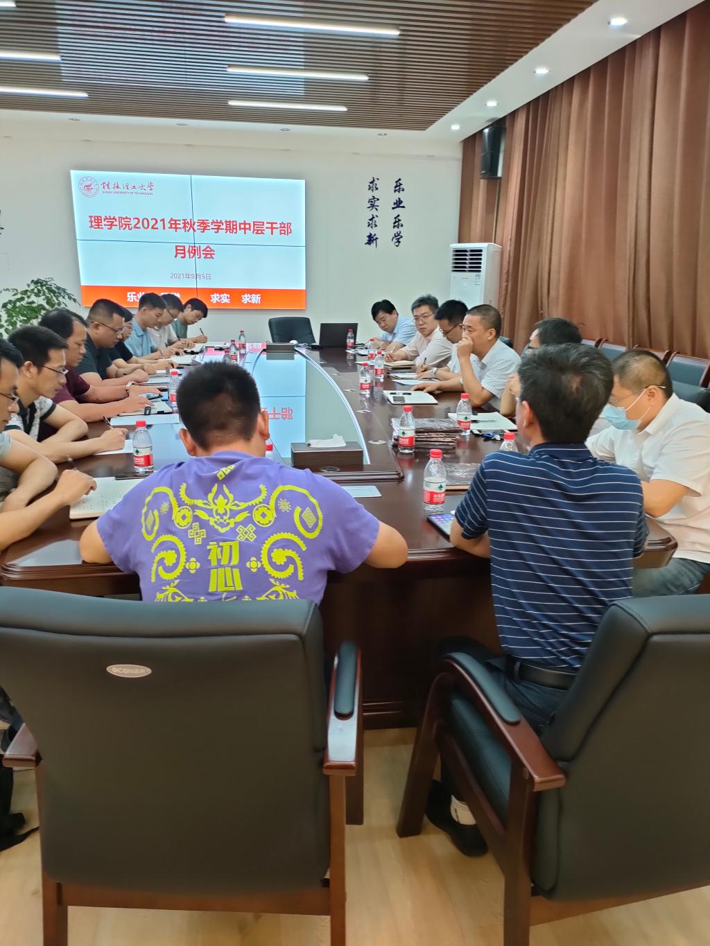 为进一步推进学院各项工作落实,加强部门间沟通与配合。2021年9月5日,学院在雁山校区08201会议室召开秋季学期第一次全体中层干部月例会,对学院党建、教学、科研以及学生工作等进行沟通交流。学院全体班子成员,教研室、实验室、办公室主任,学工办负责人出席会议,会议由党委书记欧阳胜权主持。