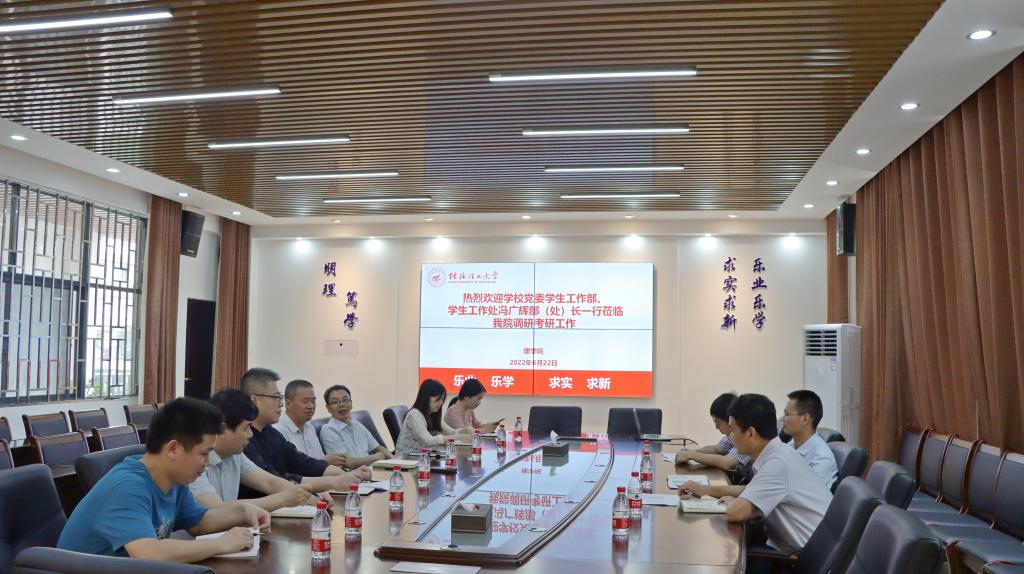 6月22日,学校党委学生工作部、学生工作处冯广辉部(处)长一行莅临必赢国际官网调研考研工作,学院院长肖剑荣、党委副书记钟立军、副院长张富文、副院长李明在08201会议室接待了冯广辉部(处)长一行,会议由学院院长肖剑荣主持,全体辅导员参加会议。
