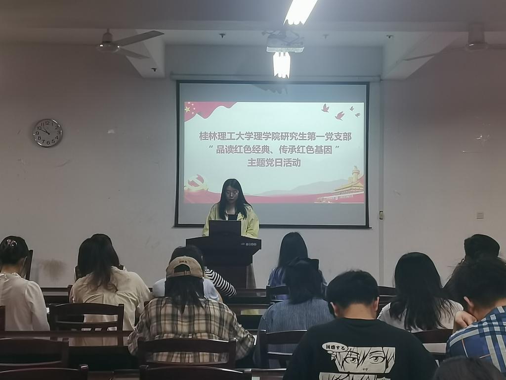2023年4月19日上午在雁山校区07122教室,必赢国际官网研究生第一党支部展开“品读红色经典,传承红色基因”主题党日活动。此次活动由支部副书记胡倩同志主讲,支部书记周黎钰老师和支部全体党员参加学习。